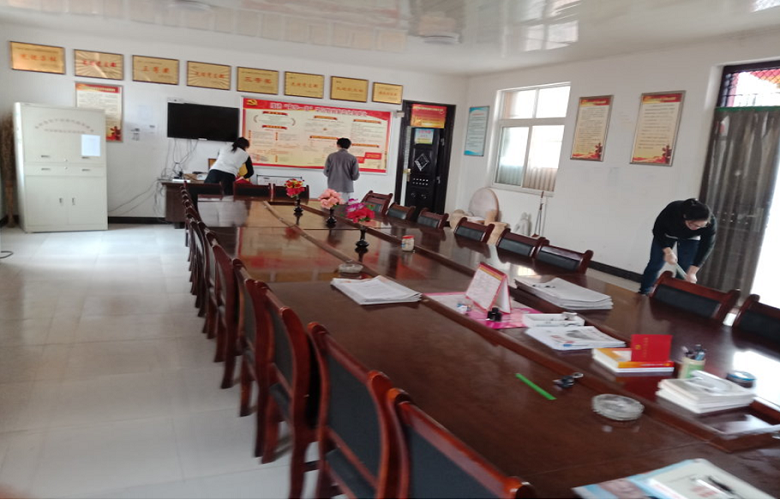 下午14:30,见村委会开门,村主任助理们便迫不及待地迎上去,向村主任交待此行的目的并向村主任表达了感谢之情。不一会,村主任助理便操起工具开始整理打扫。据了解,绛南村人少,村委会的打扫任务一般由村长或书记等四个男人来做,有时比较忙,不开会时就很久才打扫一次。通过窗户里透进来的阳光,可以看到会议桌上散落的灰尘和墙角郁结的污渍。村主任助理吴筱洁说,拖把许久未清洗,为了洗干净费了不少功夫,但是想到村主任对他们的帮助,这点小事就不算什么。经过一番有序的打扫,村委会看起来比原来干净多了,细心的村主任助理们连空调和柜子把手都擦了。